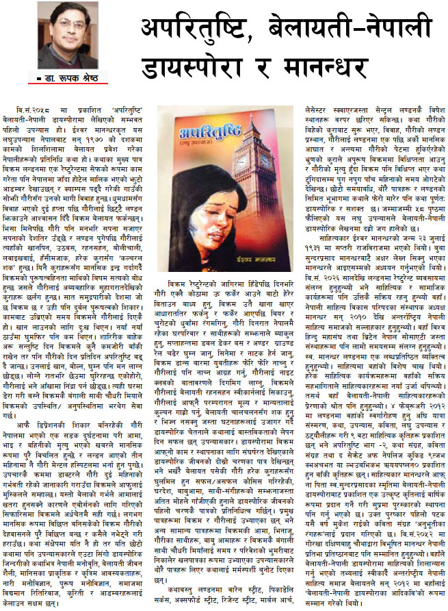 सत्यतथ्य मासिकको जुलाइ २०१४ को अङ्कमा डा. रूपक श्रेष्ठद्वारा लिखित पुस्तक समीक्षाबाट जानकारी प्राप्त